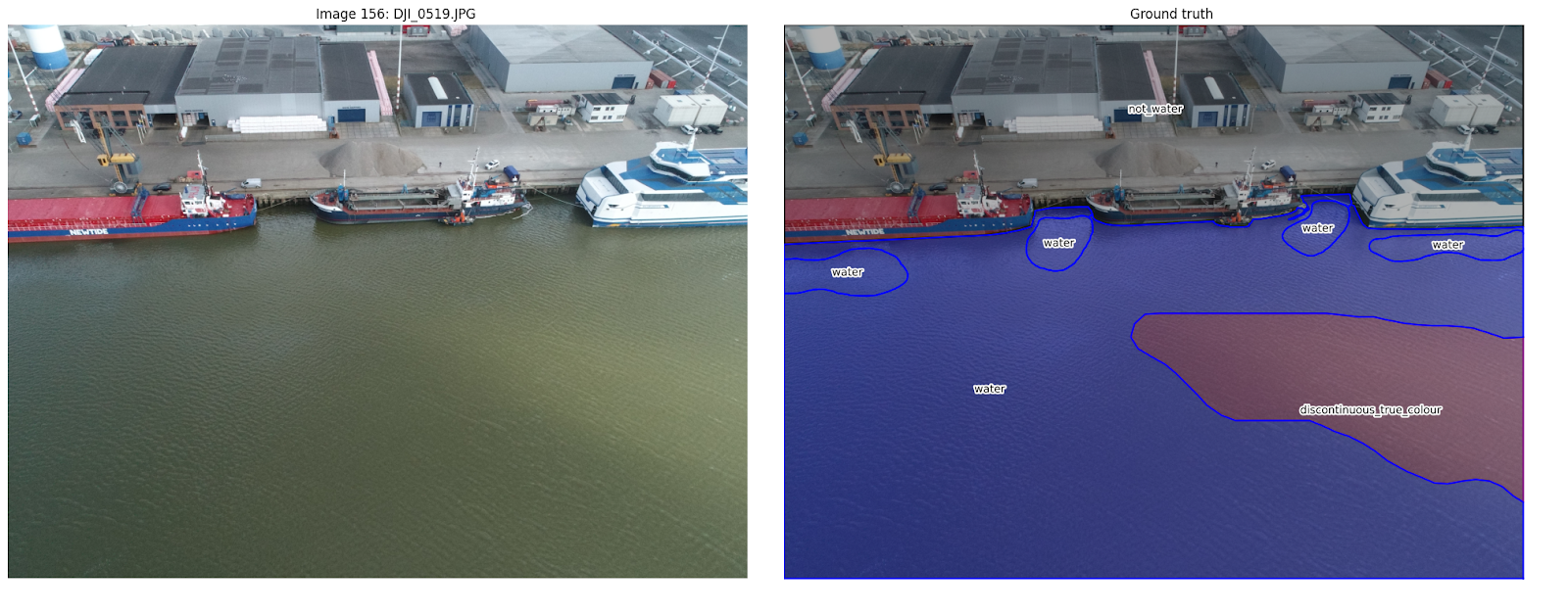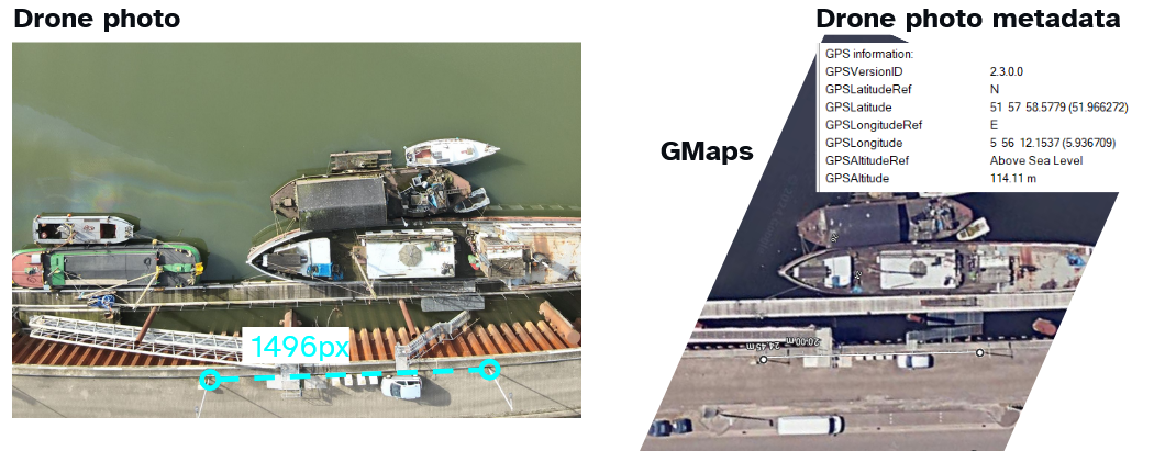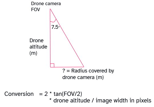 3) the altitude of the drone with respect to the water surface, provided via GPS, to calculate the conversion from image pixels to square meters.