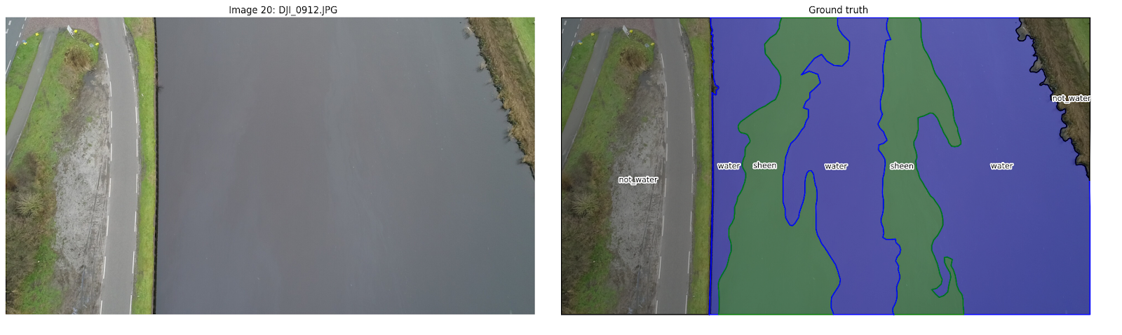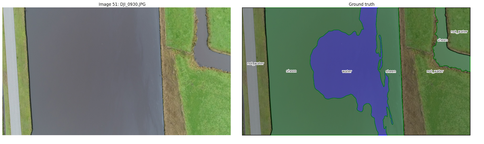 Several challenges affected the usability of the provided images with annotation, primarily due to issues with annotation quality and visibility of the oil spills. Regarding annotation quality, we encountered two main problems: incorrect annotations, where labels did not accurately reflect the content, and inconsistent annotations, where similar features were labeled differently across images. These issues are illustrated in Figure 1. Additionally, the visibility of oil spills presented significant difficulties. In many instances, the oil spills were not discernible, and determining the precise boundaries of the spills was challenging in several images, as demonstrated in Figure 2. Due to these limitations, a substantial number of images were deemed unsuitable for our analysis, resulting in a final dataset of 90 adequately annotated images.