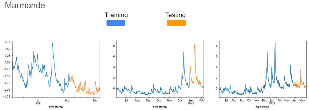 At Cadillac, the sensor station close to the coast, performance could be improved by fine tuning the seasonality measurements. Seasonality in this case means the influence of tides and ebbs on floods of the exposed river estuaries. The expert knowledge of including these seasonalities in the model would make it easier for the model to make accurate predictions.