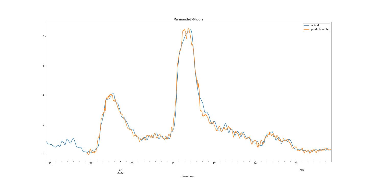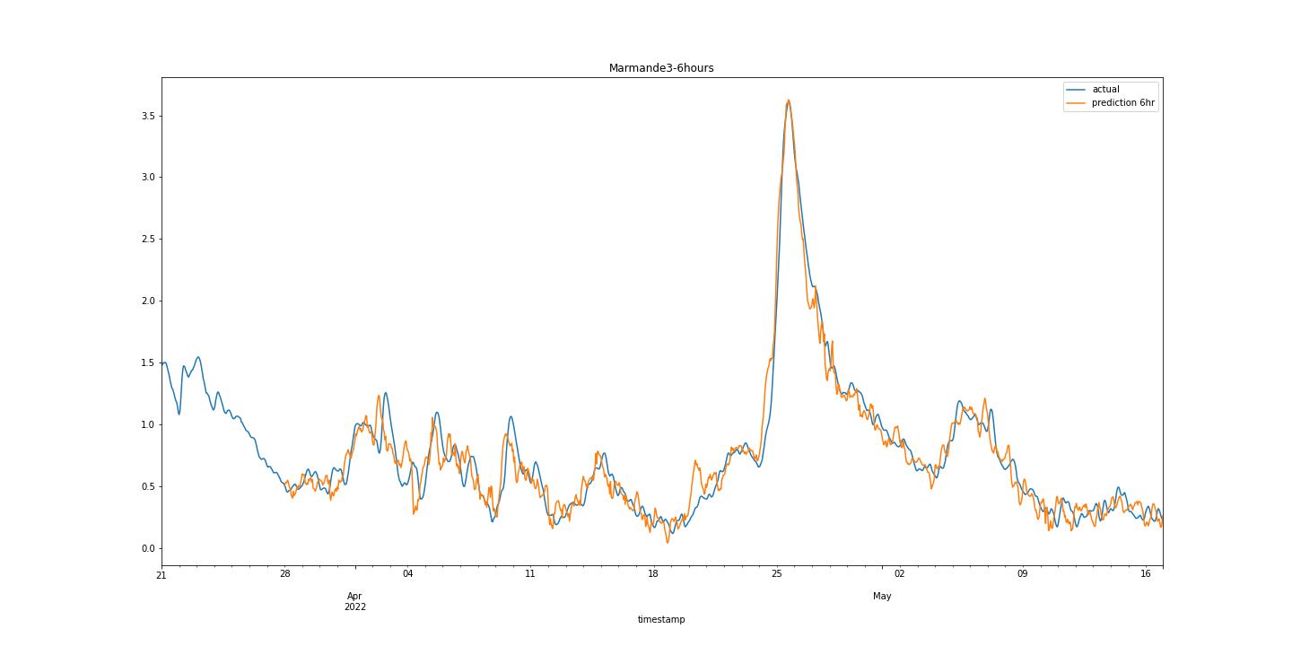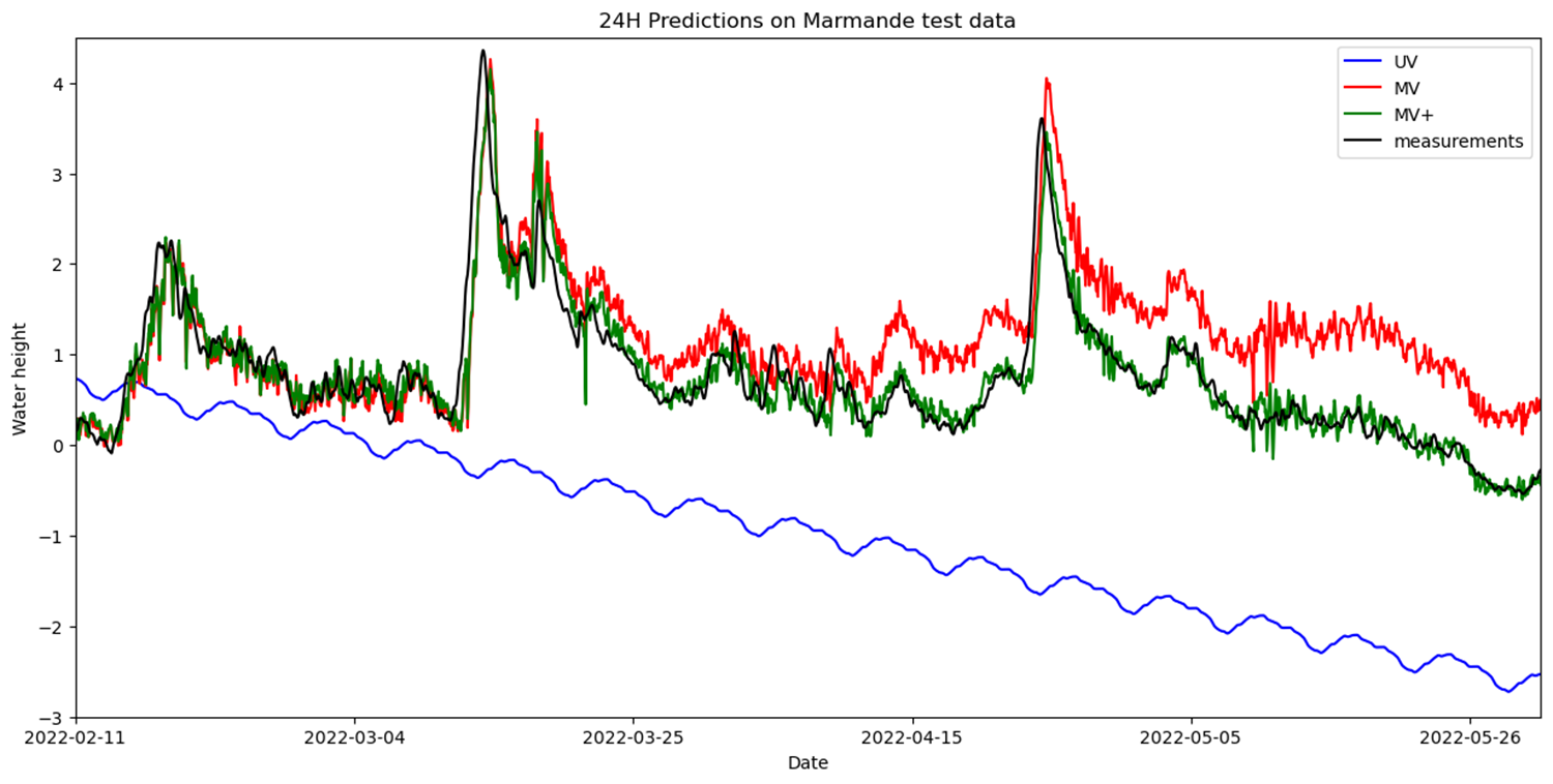 The multivariate model gives great forecasts. At the Marmande dataset, performance could be improved by including more events, which is a feature of the Prophet model. An example event would be, if the water has risen 1m within a given timeframe, then the event is triggered. This could improve performance at flooding events.
