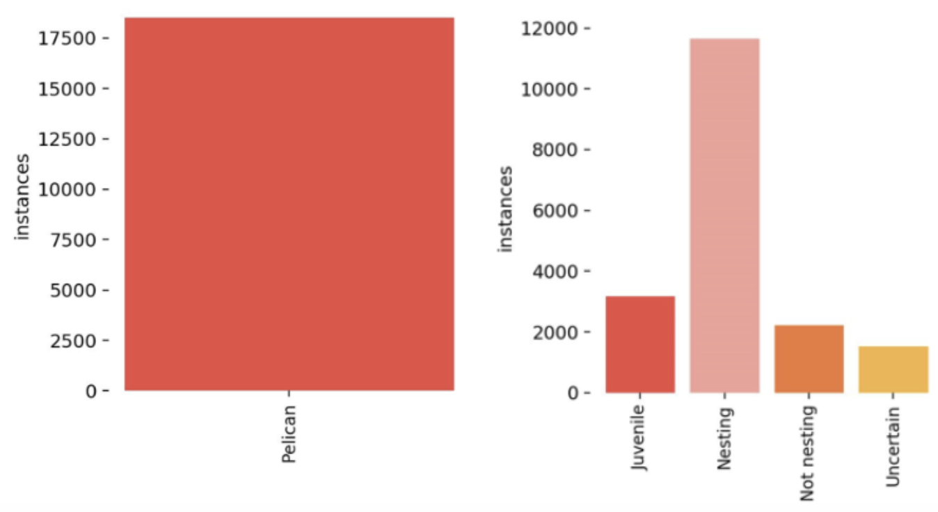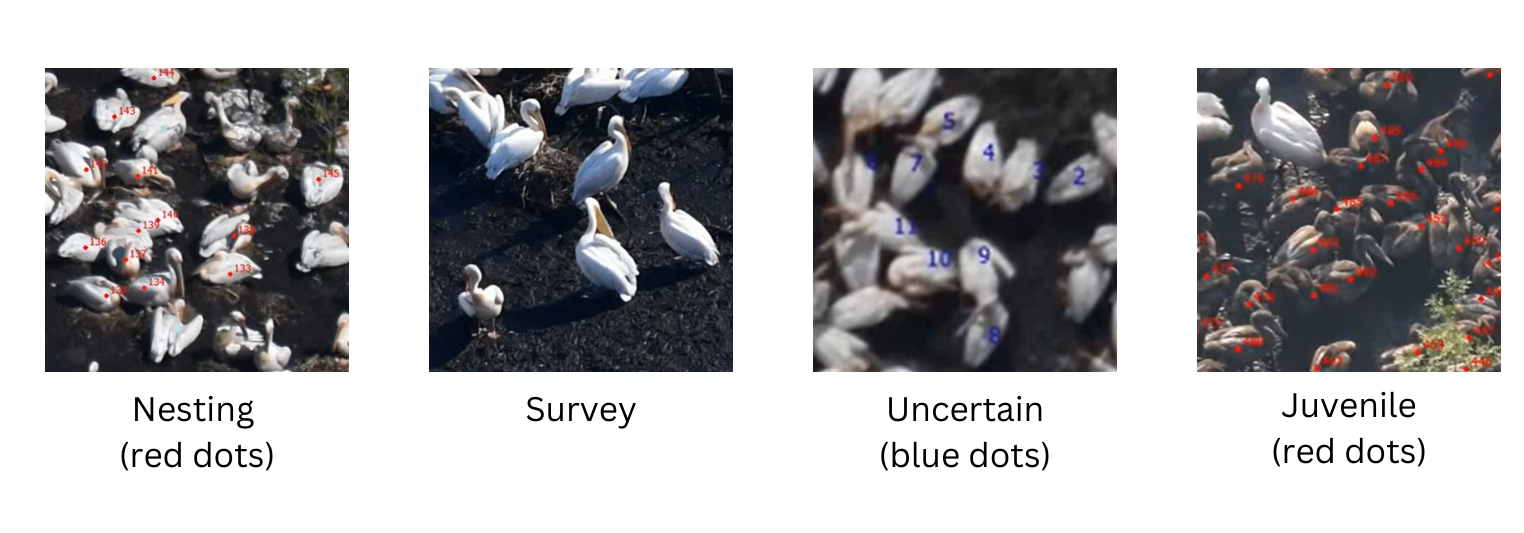 In the initial annotations from SOR, individual pelicans were manually located and assigned to one of four categories using the ‘Count tool’ in Photoshop. However, the proprietary .psd file format is not directly accepted in open-source frameworks like PyTorch or TensorFlow. In the first week of the challenge, we discovered two methods (using Python or the psdtools library) which we used to convert the images to a standard file format and extract annotations into a tabular format. We then tried to convert the point annotation into a bounding box, but this method was not very accurate due to variations in the angle of the photo, the posture of the bird, and the surroundings. This problem, combined with a large imbalance in label frequency, led us to re-annotate a set of images.