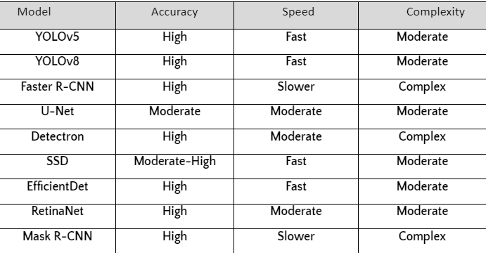 We divided the project into three stages. Firstly, we created a shortlist of nine models. Then, we conducted in-depth studies on each model to identify the most useful ones for the task at hand. Our focus criteria included complexity, resourcefulness, results, and timeframe for completion. Table 1 provides a summary of all the models.