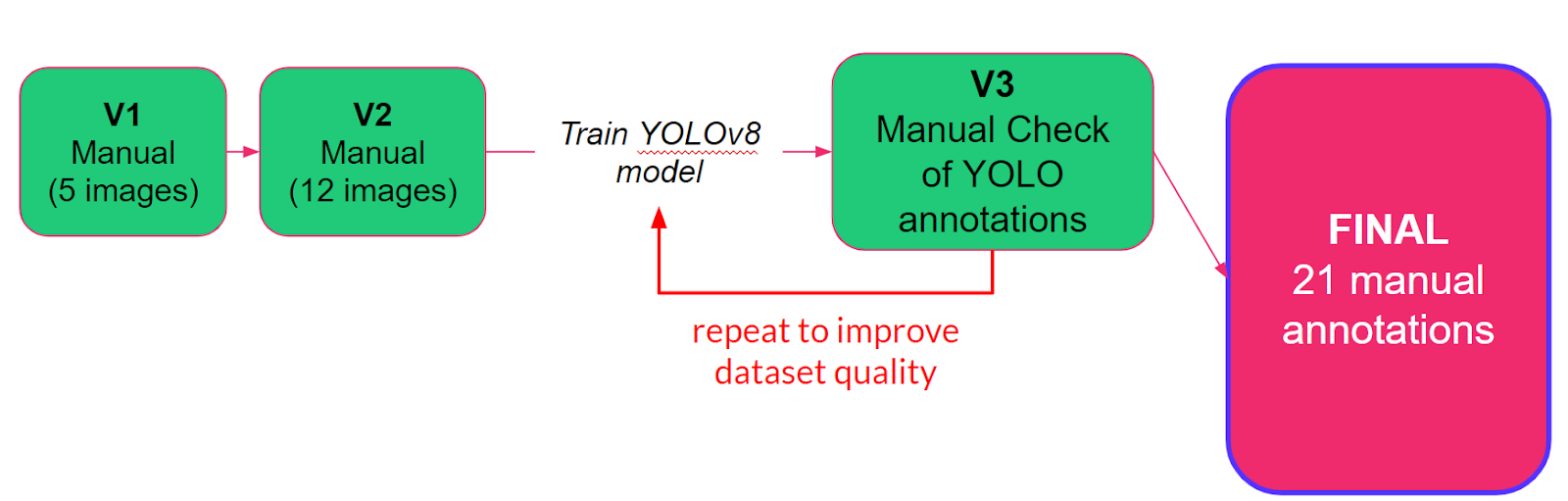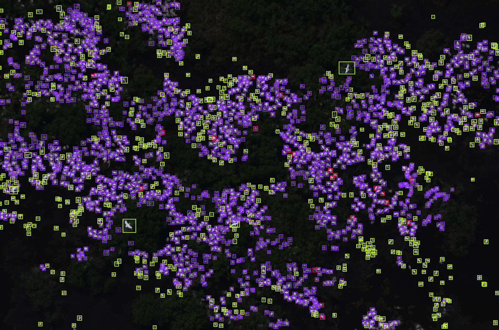 We manually annotated 12 images using Roboflow in two steps (V1 and V2). The annotated images were then used to train a YOLOv8 model to obtain a rough set of bounding boxes around pelicans. The model's performance was impressive, particularly in adult breeding colonies with well-spaced-out pelicans. However, we had to redo the annotation for dense clusters of pelicans and juvenile pelicans. Eventually, we obtained 21 well-annotated images for the model's training, validation, and testing. Although we only have 21 images to work with, they are very large (6000x4000 pixels) and we can make them suitable for training machine-learning algorithms. Currently, the maximum image input size for the Yolov8 is 512x512. Meaning that each image could be cut into approximately ~90 tiles.
