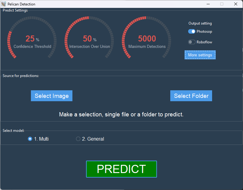 The final task for Team 2 was to implement the model into a GUI, as shown in Figure 6. Key parameters that the user can set include the detection confidence threshold, intersection over union percentage threshold, and maximum number of detections per image. Additionally, the user can choose to output results compatible with either Photoshop or Roboflow, and can even select or add another YoloV8 model for predictions.