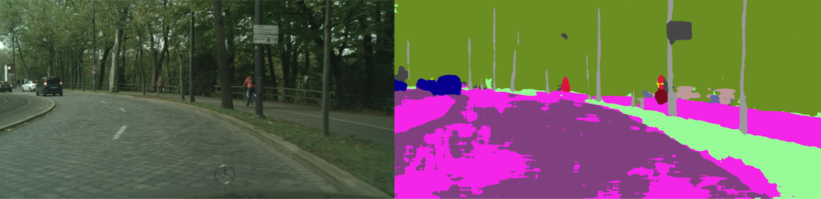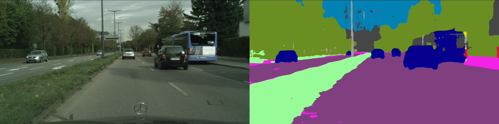 The first step was to use a segmentation model to identify objects such as roads and trees. We used three segmentation models to sort objects in an image into various categories. The models were trained on the BDD100K and Cityscapes Dataset, both of which are open source.