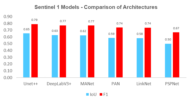 The following chart compares the performance of different segmentation architectures used in the Sentinel 1 pipeline with regards to IoU and F1 Score on the test dataset (Encoder, Encoder Weights, Batch Size, etc were kept the same as the best performing model):