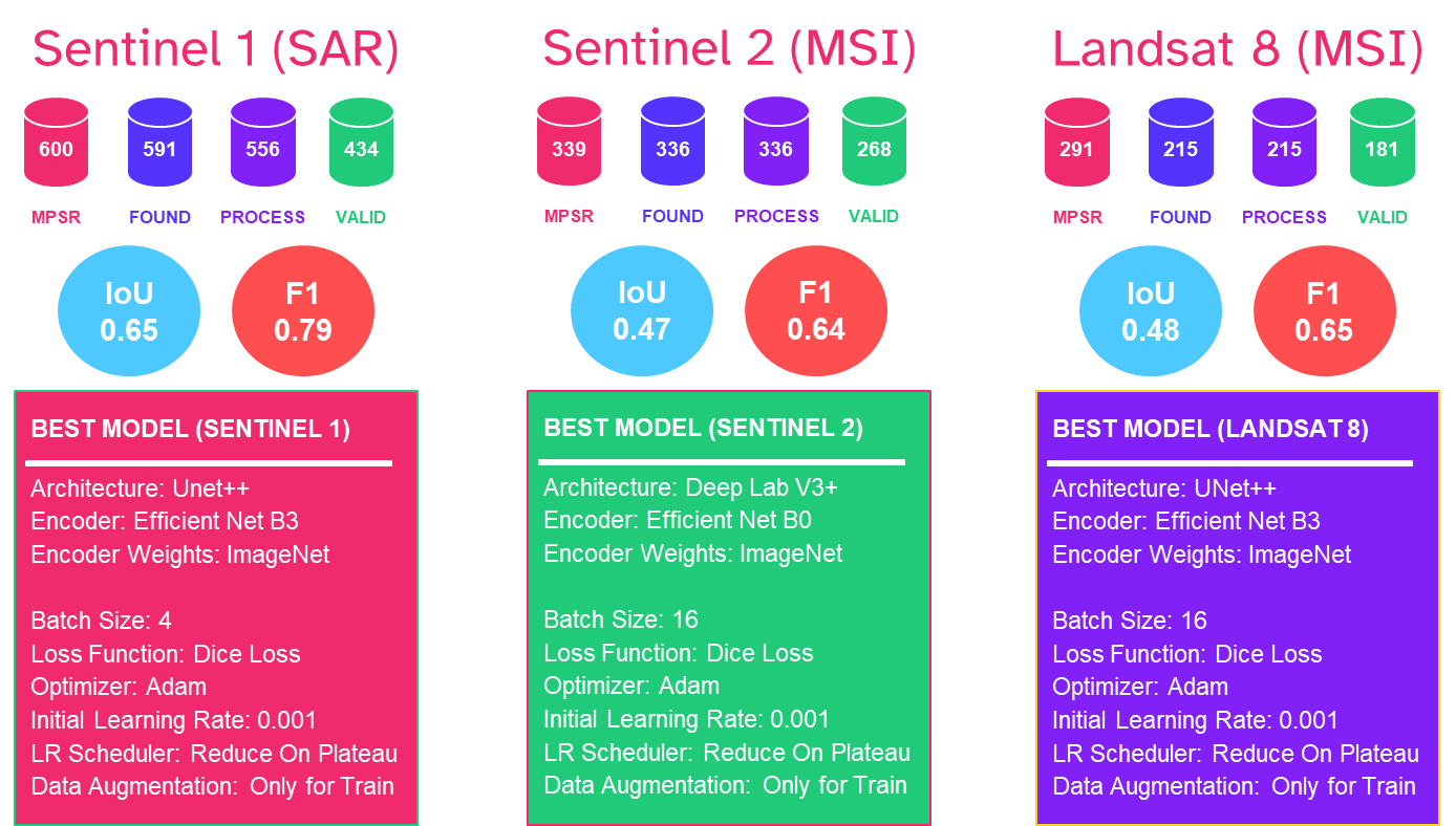 The models based on SAR images (Sentinel 1) gave better results in this Challenge, when compared to the models based on MSI images (Sentinel 2 / Landsat 8). This seems to be in line with the fact that the majority of literature on oil spill detection is based on SAR imagery.