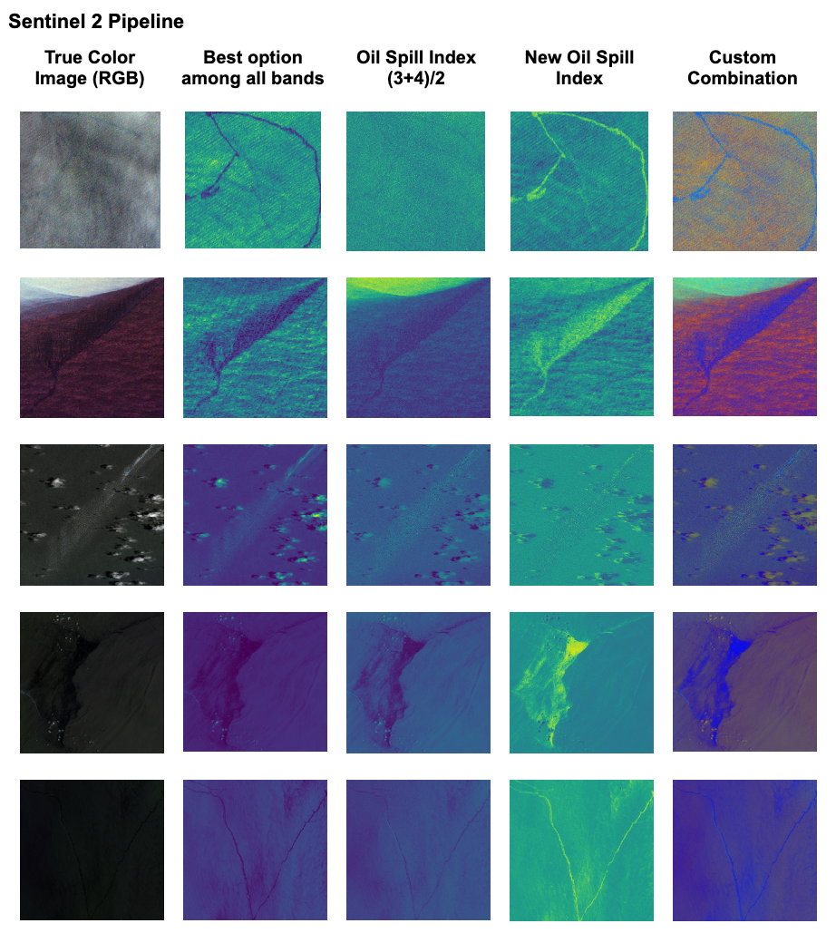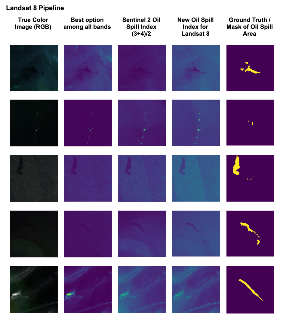 Based on the analysis of spectral reflectance across all bands we were able to identify two new spectral indices, one each for Sentinel 2 and Landsat 8, that help in the quick identification of oil spills from MSI images and also provide compact feature representation for use as input to train machine learning models.