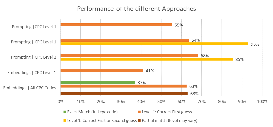 Some variations of turning the CPC classes into vector embeddings and comparing their cosine similarity with the client texts was also attempted. The results of this section could still be useful as a baseline and alternative methodology. The experiments revealed that matching text to all classes outperforms matching only to level 1 classes. The observed discrepancies between client text and class embeddings underscore the need for more precise alignment strategies, such as splitting embeddings by level. Data augmentation was shown to enhance correct embedding matching, particularly in fine-grained classifications