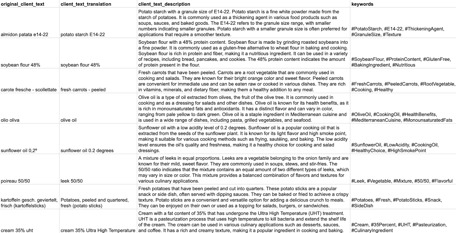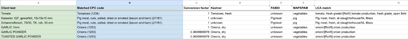 We worked with three different subsets of data, divided into different sheets, that presented information extracted from client invoices. Two of the subsets had columns with text representing the product that was listed in the invoice, and matching CPC codes or LCA names, and one of them was not matched beforehand.