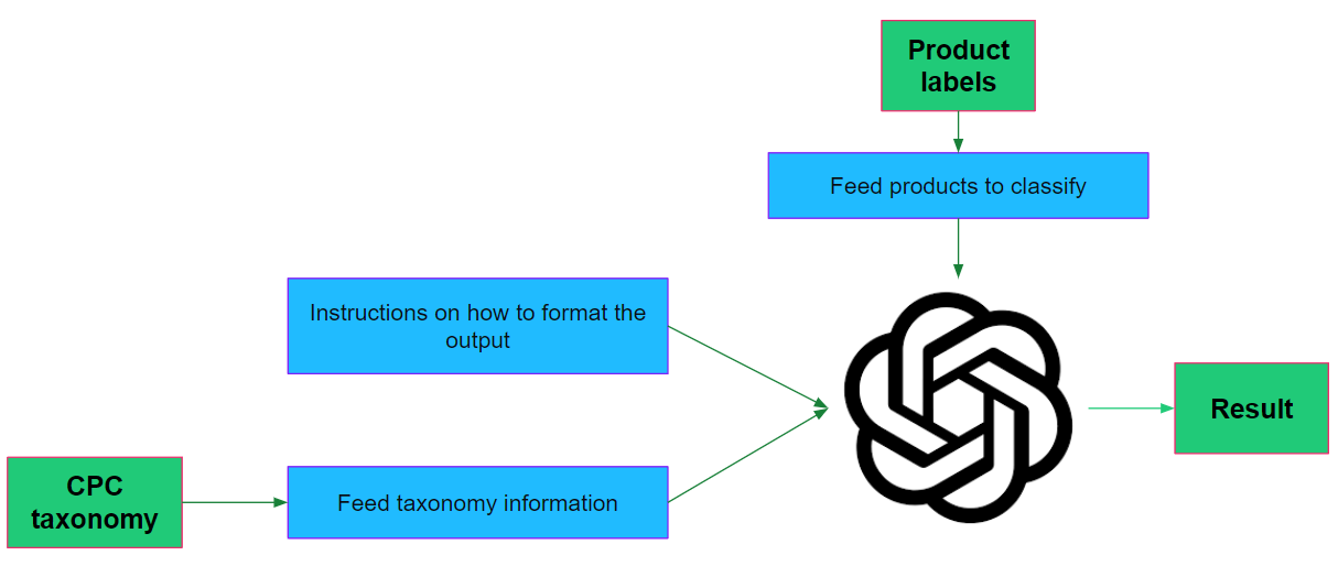 We used GPT-3.5-turbo, a conversational LLM, prompts to describe the task, and desired output and provide an example. The biggest limitation of this approach was the number of classes with lower CPC levels. In our experiments, the level 3 classes already exceeded the context window limit. As context windows in future models increase, this may be less of an issue.