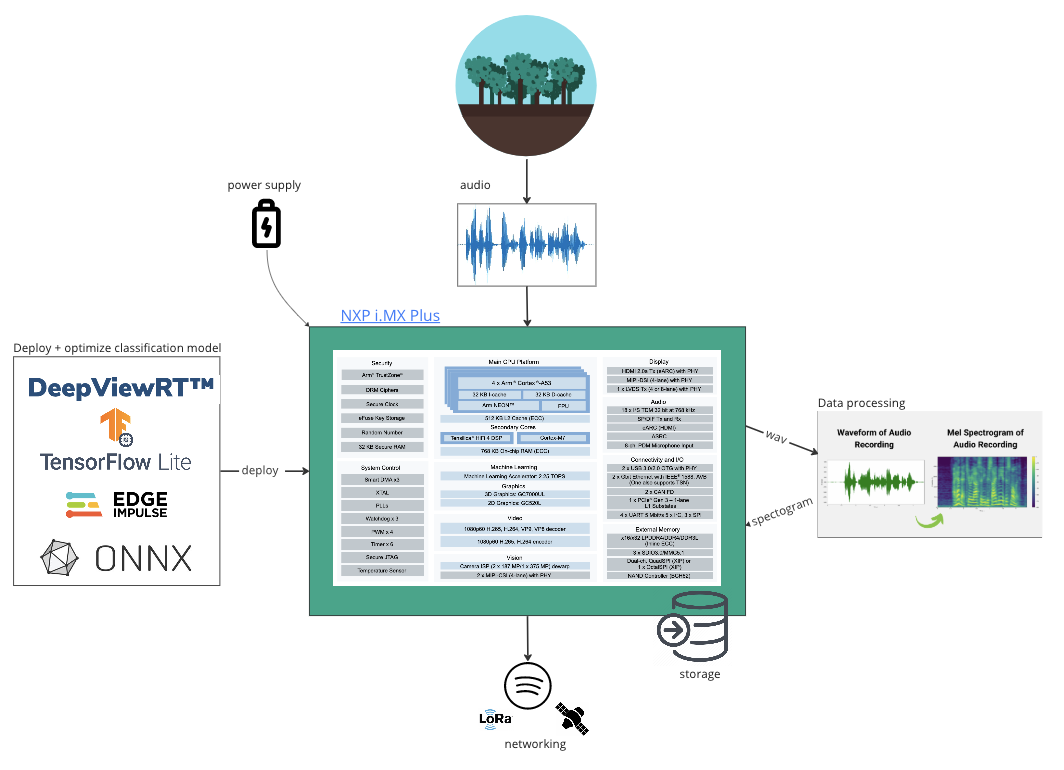 Where elephants live, there is no power grid or network connection. The detection model needed to run on a small chip, powered by only a battery or maybe a solar panel. This pushed the FruitPunch community into the domain of edge computing. Luckily, they had some backup: Global semiconductor powerhouse NXP provided them with several SOC (system on a chip) boards for developing a prototype acoustic detector.