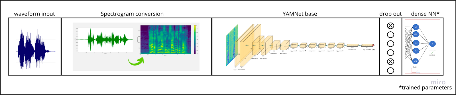 After conducting extensive experiments with Edge Impulse, we were able to compress the original 11 MB YAMNet model to a much smaller 4 MB size. Moreover, we conducted performance tests to compare the CPU with the NPU (Neural Processing Unit) for YAMNet. The results were interesting as the CPU had an average inference time of 28 ms for a 0.975-second clip while the NPU, once warmed up, achieved an impressive 19 ms per inference, providing a significant 30% increase in inference speed.