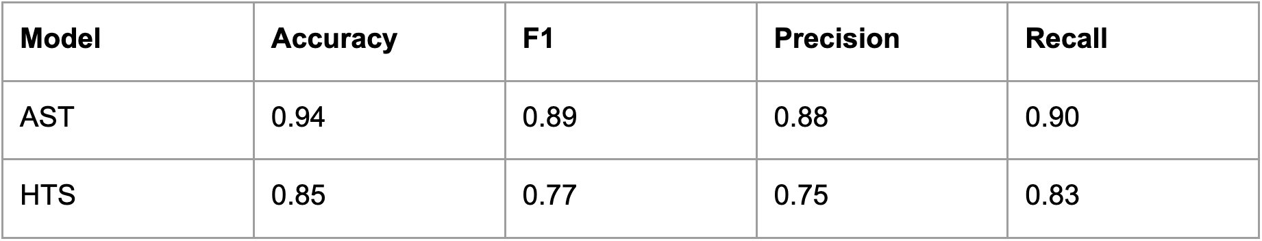 After experimenting with various model architectures the two approaches that were the most promising were using an Audio-Spectrogram Transformer (AST) and Hierarchical Token-Semantic Audio Transformer (HTS-AT). Their performance is shown in the table below.