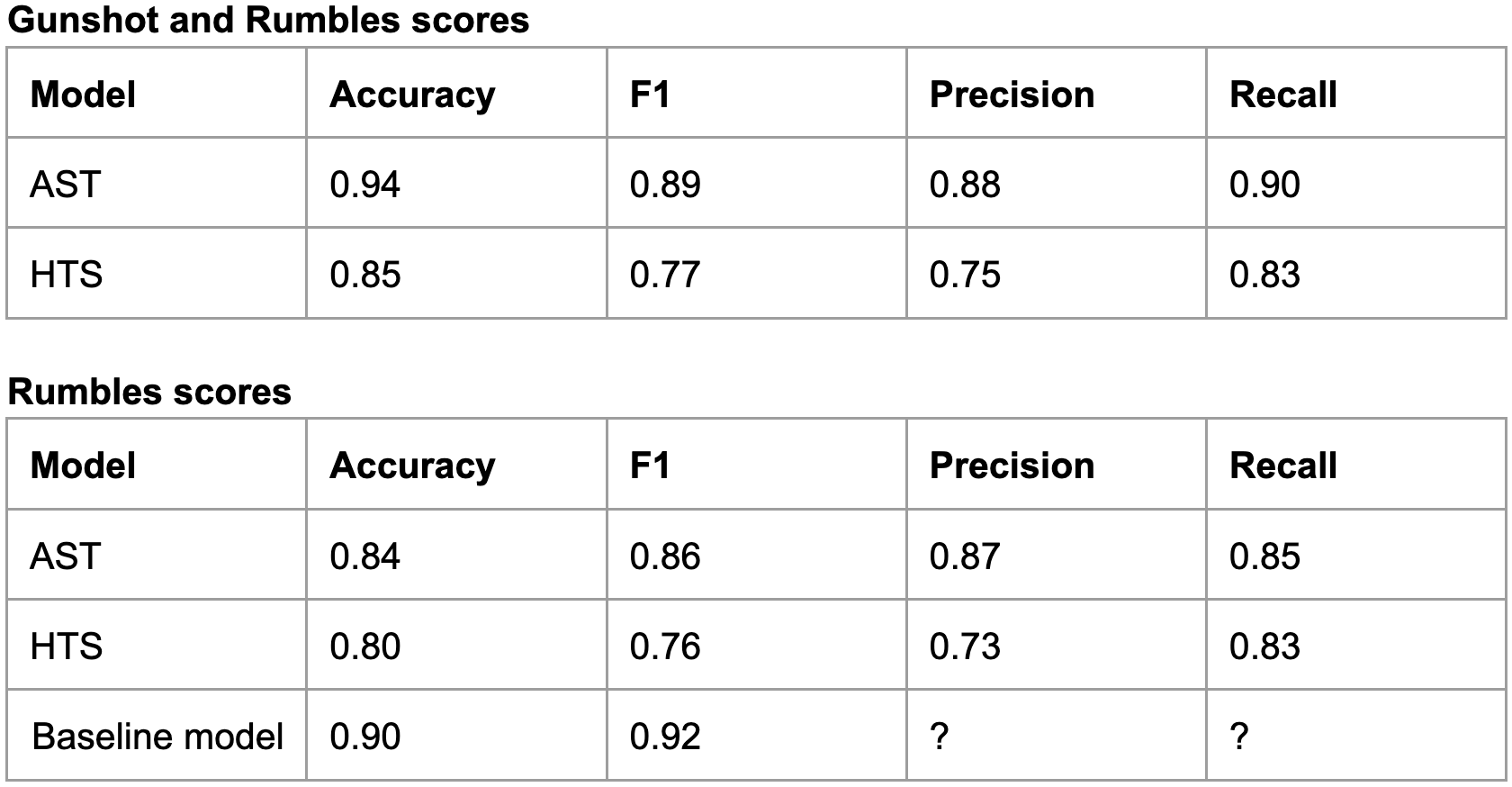 In the first table, you can see the metrics for both the gunshot and the rumbles. AST outperforms HTS on the development set. In the second table, you can see the scores when you limit the events to the rumbles. In this case, the performance drops a bit and does not seem to outperform the previous model used.