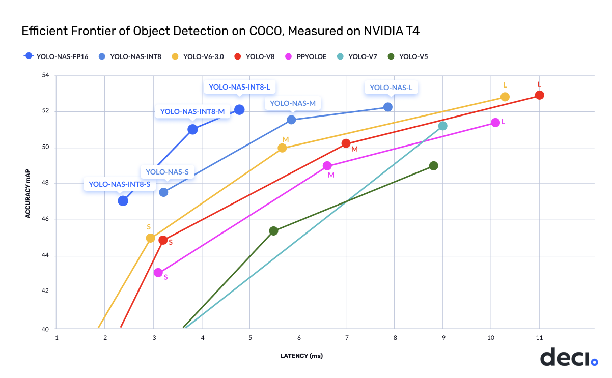 YOLO-NAS - developed by Deci to deal with problems found in the YOLO family: inadequate quantization support and insufficient accuracy-latency tradeoffs by implementing the Neural Architecture Search technology developed by this company. It has been shown that they outperform the YOLO family of models in terms of latency.