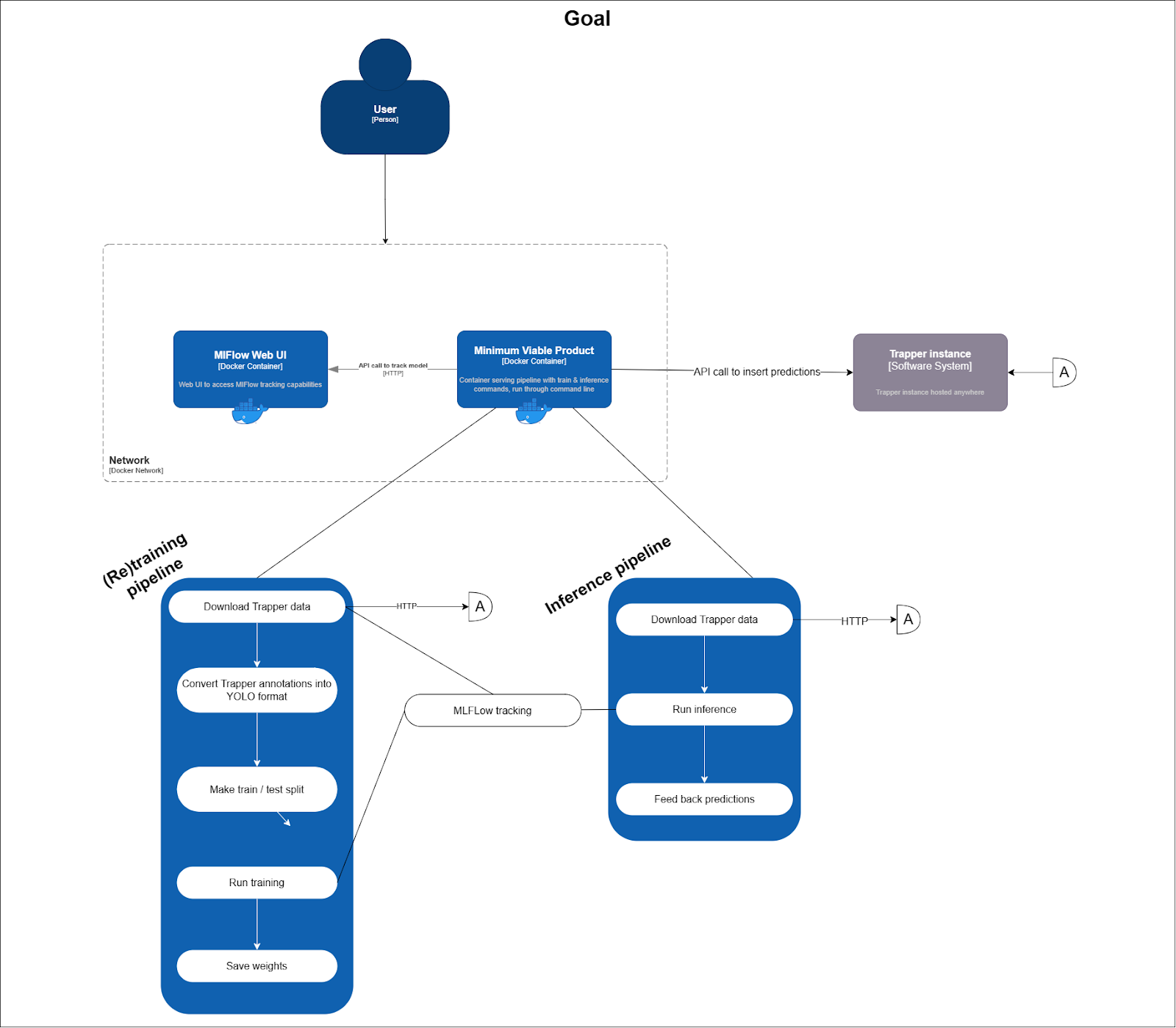 This team aimed to create a pipeline that seamlessly integrates with the Trapper API in various ways. One of its main features is allowing users to upload their camera trap images to Trapper and retrieve the resulting data. On the other hand, users can also access the location-specific datasets already available in Trapper. The pipeline is foreseen with models that can be trained using the location-specific data, and predictions can be made from them. Additionally, users have the freedom to upload their custom models into the pipeline to train them.