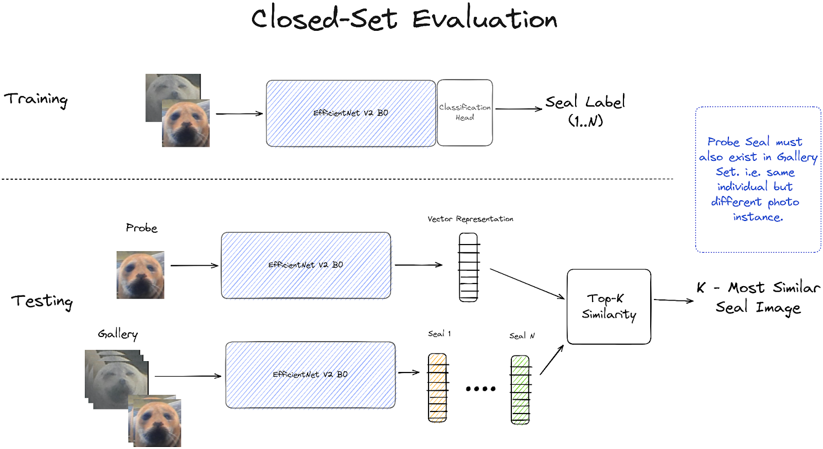The problem can be tackled in two ways. The first one is the classification task in the closed-set problem, i.e. given an image of seal face (‘probe seal’) and a gallery of known seals images, determine who it is. The other one is the open-set problem, where given two seal images, determine the similarity score between them. The second task can be accomplished with the same model with the classifier head chopped off.