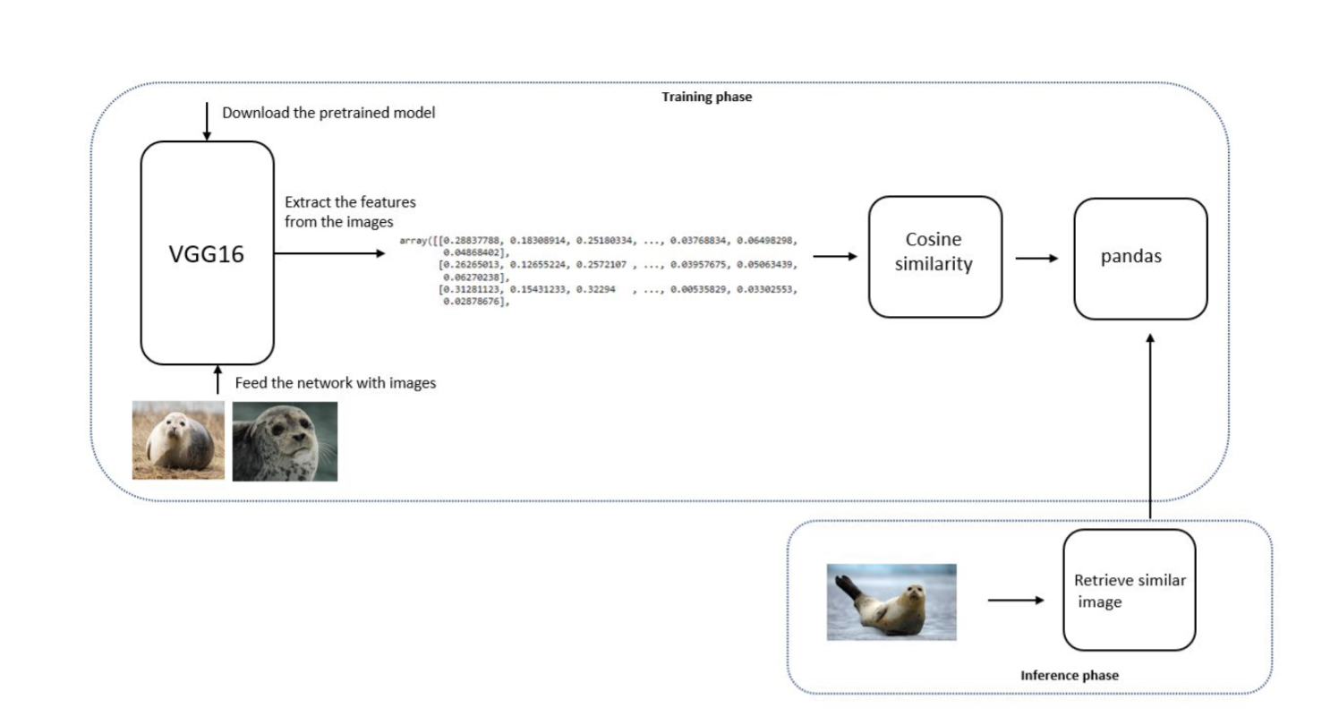VGG16 utilizes a deep-learning CNN model. In the training phase, a batch of pre-processed images (resized to 224X224) images is sent to the downloaded VGG model for feature extraction. The extracted feature is then sent to a cosine similarity module that computes the similarity between the images. The computed similarity is then stored in a pandas data frame. In the inference phase, a new image is sent to the “retrieve similar image” module. This module performs the same functionality as the training phase and then computes the similarity of the new image with the one that is computed in the training phase.