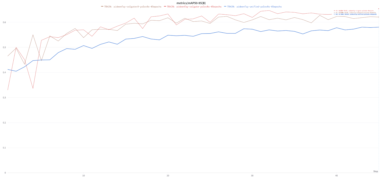 This result was initially surprising to us as we expected that the model with the most training examples of seal faces (unified-yolov8s-45-epochs) would demonstrate the best performance. However, this was not the case as it underperformed all the models we trained purely on the labeled Colgate data. Interestingly (especially given what we will see later), the augmented Colgate data scored marginally worse than the model trained on the non-augmented Colgate dataset.