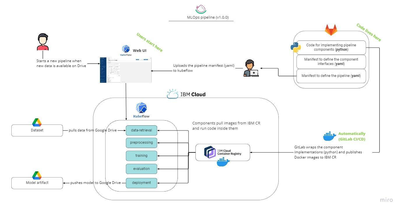 We started off with research into the available technologies. We went for GitLab to create the CI/CD pipeline. This is where we also stored the code and converted it to docker images. These images were stored in an IBM cloud registry which is called by the components in Kubeflow. These components form the machine learning pipeline that gets the data; preprocesses it; trains; evaluates; and then stores the model in Google Drive.